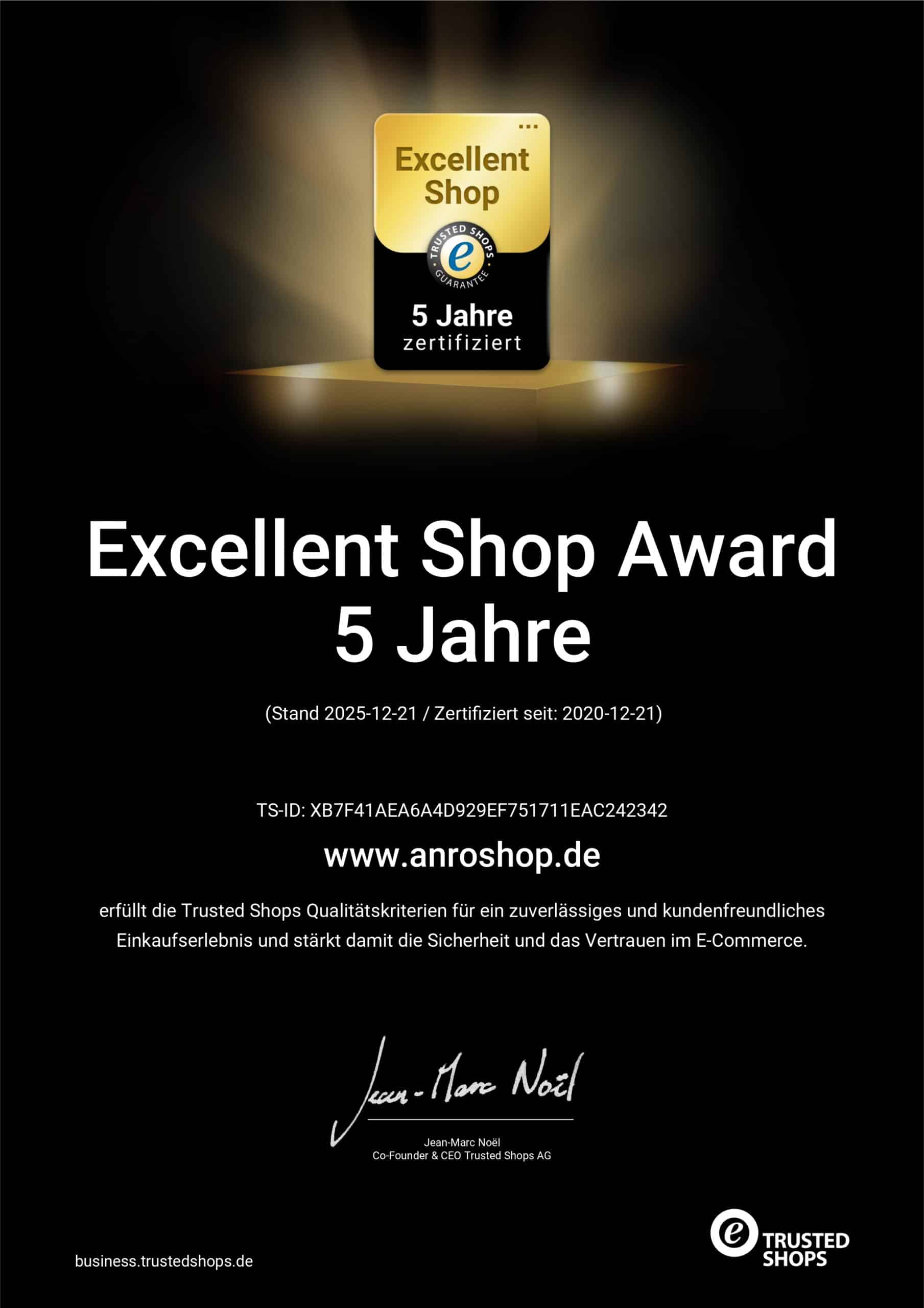 Jede positive Erfahrung lässt das Vertrauen wachsen, das gilt im Besonderen für den Einkauf in Online Shops. Dieses Gefühl macht den Kern des Excellent Shop Awards von Trusted Shop aus. Wir haben diese Auszeichnung erhalten, weil wir fünf Jahre lang durchgehend die Trusted Shop-Zertifizierung für anroshop.de gehalten haben – ein Beweis für unsere konstante Qualität, eine verlässliche Leistung und die sorgfältige Abwicklung jeder einzelnen Bestellung. Dieses Gütesiegel bestätigt uns in unserem Ansatz, für unsere Kunden alles zu geben – jeden Tag aufs Neue!
