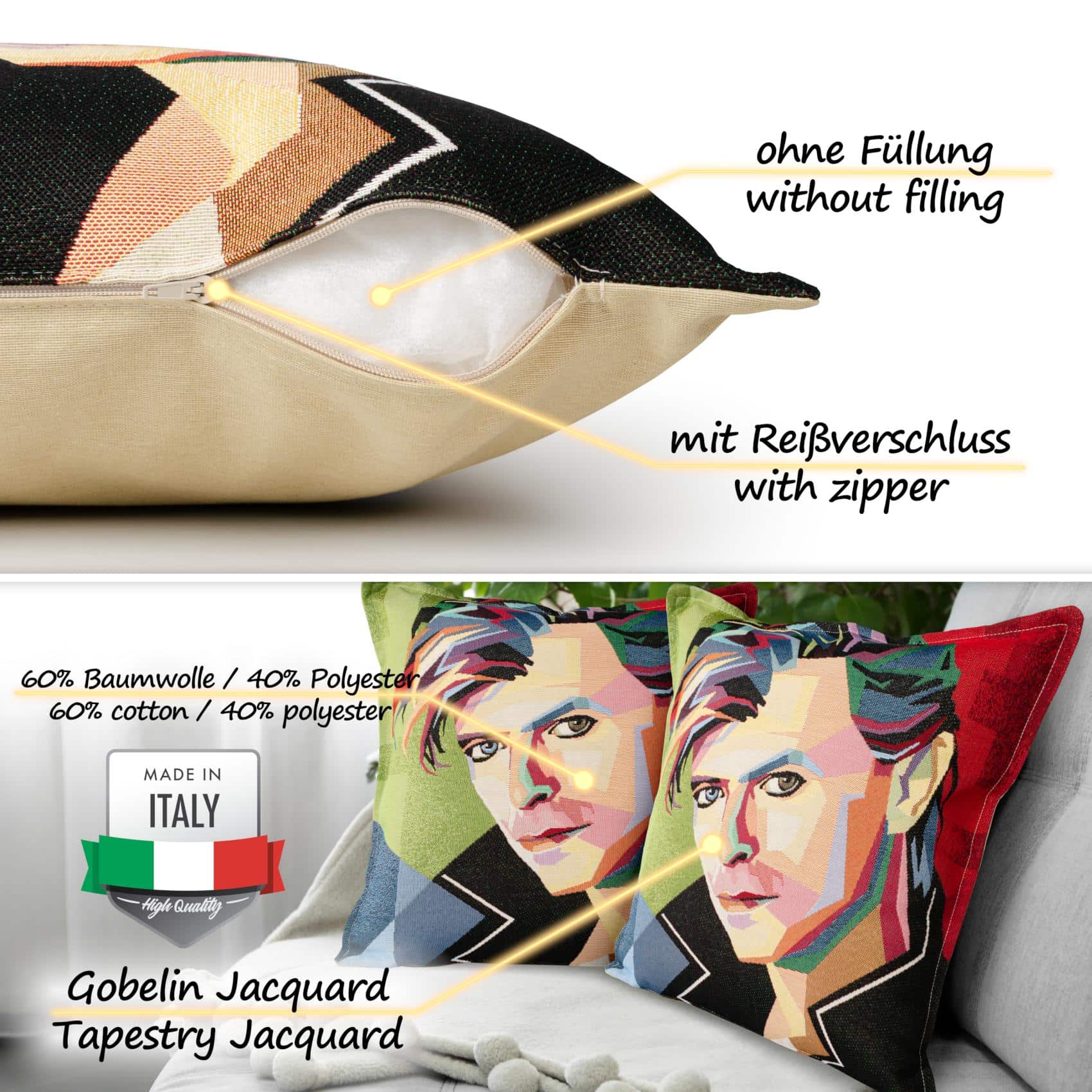 Bringen Sie den legendären Stil von David Bowie in Ihr Zuhause mit unserem 45x45cm großen Gobelin Kissen, gefertigt aus 60% Baumwolle und 40% Polyester. Dieses Sofakissen bietet ein eingewebtes Design, maschinenwaschbare Qualität bei 30°C, und wurde in Italien hergestellt – ein stilvolles Highlight in Premium-Qualität.