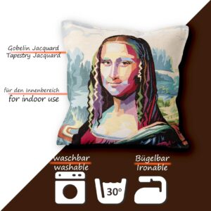 Verleihen Sie Ihrem Zuhause einen Hauch von Kunstgeschichte mit unserem Gobelin Kissen, das das berühmte Gesicht der Mona Lisa zeigt. Dieses stilvolle Sofakissen, gefertigt aus einer hochwertigen Mischung von 60% Baumwolle und 40% Polyester, bietet erstklassige Verarbeitung und Haltbarkeit. Die Größe von 45x45cm macht es ideal für jedes Sofa oder Sessel und es ist sowohl mit als auch ohne Kissenfüllung erhältlich. Das Motiv von Mona Lisa ist eingewebt und nicht bedruckt, was Premium-Qualität und eine besondere Haptik gewährleistet. Ein praktischer Reißverschluss ermöglicht einfaches Abnehmen des Kissenbezugs, der bei 30°C maschinenwaschbar ist. Hergestellt in Italien, vereint dieses Gobelin Kissen stilvolles Design mit exzellenter Handwerkskunst und bringt einen künstlerischen Akzent in Ihren Wohnraum.