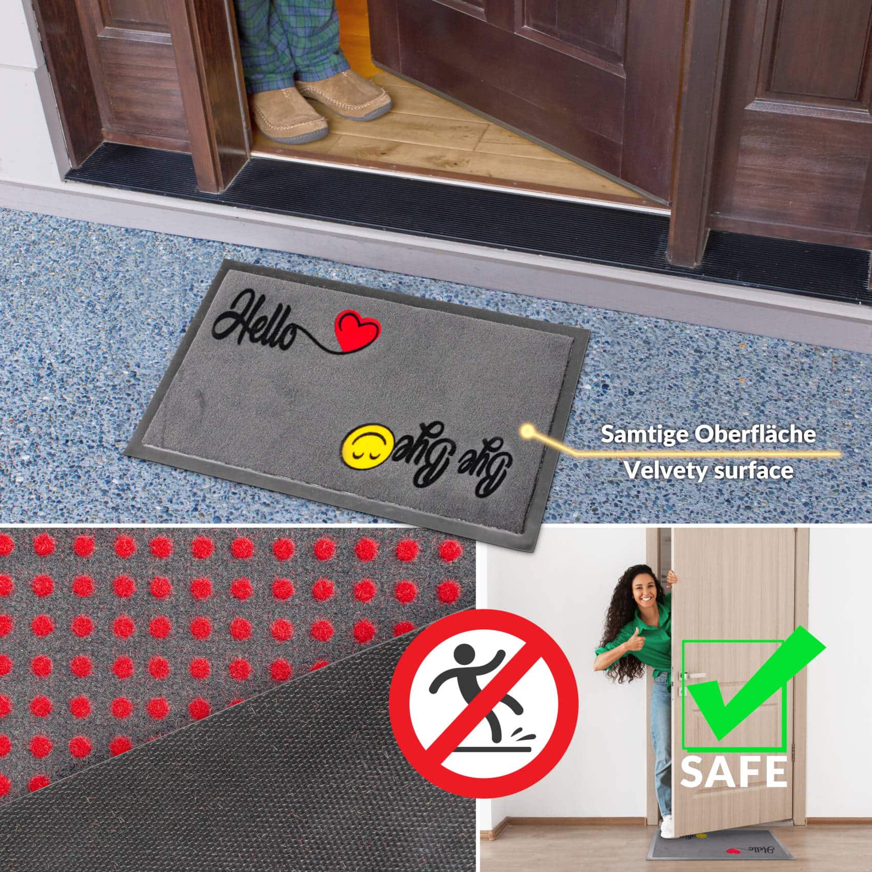 Die Schmutzfangmatte „Hello Bye Bye“ nimmt Feuchtigkeit effektiv auf und sorgt dafür, dass Schmutz und Nässe draußen bleiben. Dank der rutschhemmenden Gummi-Rückseite und den bequemen Anlaufkanten bietet sie optimale Sicherheit und Komfort bei jedem Schritt. So können Ihre Gäste in einem stilvollen und sicheren Umfeld empfangen werden.