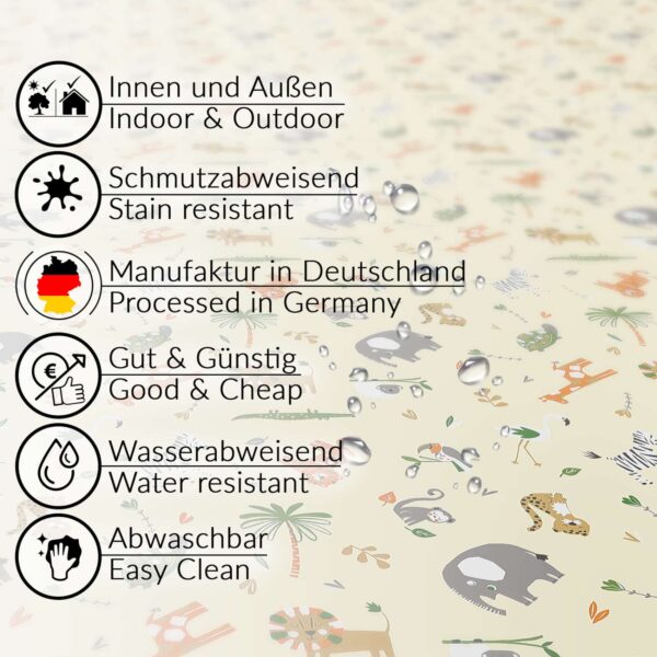 Unser Wachstuch ist mit PVC beschichtet somit sehr pflegeleicht: Wasser- und schmutzabweisend, als auch schonend für die Tischoberfläche. Mit unserer abwaschbaren Tischdecke ist Ihr Tisch oder jede andere Oberfläche vor Flüssigkeiten und Verschmutzung bestens geschützt. Dies liegt unter anderem daran, dass die Wachstischdecke aus mit Kunststoff beschichtetem Gewebe gefertigt wird. Dieses Gewebe besteht aus einem recyclebarem Vliesstoff. Dank der Kunststoffbeschichtung ist die Tischdecke resistent gegenüber den üblichen Verschmutzungen, welche beim Essen entstehen. Unsere Tischdecken sind pflegeleicht und einfach zu reinigen. In den meisten Fällen genügt bereits ein feuchtes Abwischen und schon ist das Wachstischtuch wieder wie neu. Sie sehen: Unsere Wachstuchtischdecke ist Ihr idealer Begleiter für jeden Anlass. Entdecken Sie unsere große und farbenfrohe Auswahl in verschiedenen Mustern, Designs und Größen.